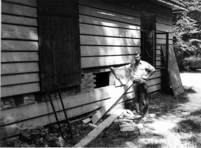 Der Zahn der Zeit und die Nutzung als Wohnung hatten der Jagdhütte im Laufe der Jahre hart zugesetzt. 1978 wurde sie deshalb gründlich renoviert. Damals mussten dringend die Rollschicht und die Haupttragbalken (Sohle) erneuert werden, denn die Nässe zog in die Ständer. Hinter der Außenschale verbirgt sich ein Fachwerk mit Steinen ausgemauert. Forstwirtschaftsmeister Herr Adolf Wilder mit seinen Kollegen erneuerten Rollschicht und Haupttragbalken, indem die Jagdhütte mit Wagenhebern sektionsweise angehoben wurde. Im Rahmen der Kaminerneuerungsarbeiten stieß wir auf einen kuriosen Fund: drei Weißweinflaschen aus der Zeit um die Jahrhundertwende wurden unten dem Dielenboden gefunden. Ein Bruder des letzten Großherzogs war damals zu einer „Entziehungskur“ in den Wald verbannt worden, hatte sich aber vorsorglich mit den Getränken versehen, indem er sie vor Antritt des „Zwangsurlaubs“ dort versteckte. Diesmal waren es Weißweinflaschen, in den 1930iger Jahren hatte man schon Rotweinflaschen gefunden.